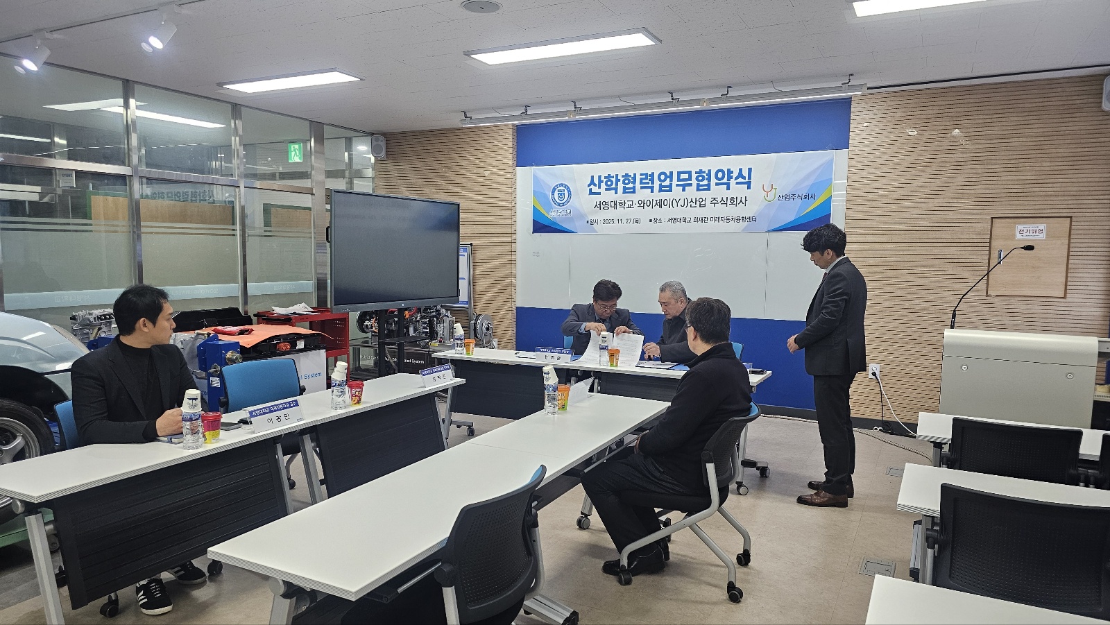 O ‘미래자동차 기술융합센터’에서 진행된 업무협약식에는 서영대학교 산학협력단 봉필준 경기도 RISE 사업단장, 미래자동차과 송락현 학과장, 미래자동차과 이광민 교수 등 학교 관계자와 와이제이산업(주)의 박태동 대표이사, 김영진 연구소장 등 산업체 관계자가 참석하였다.