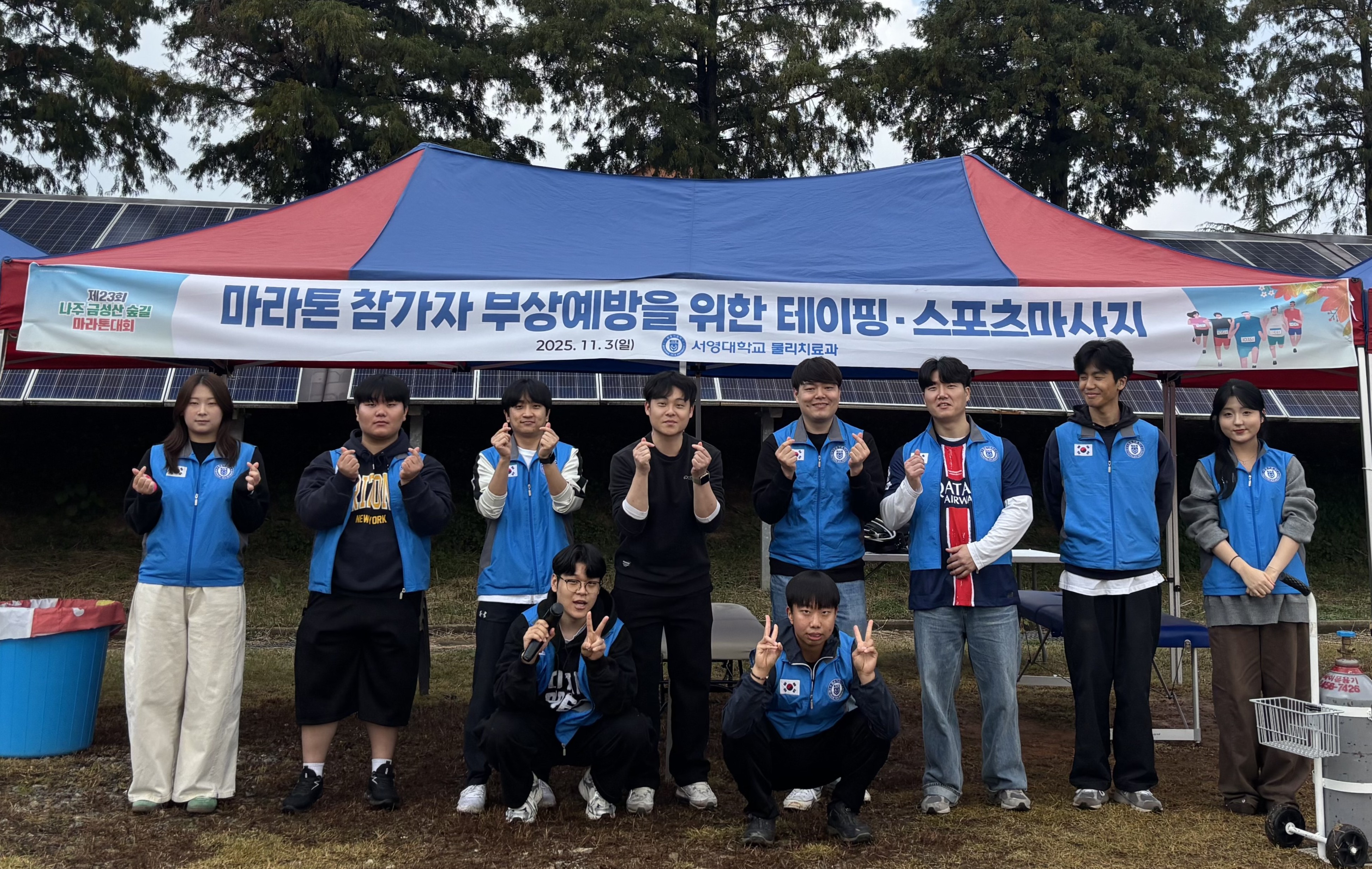 ○ 서영대학교 물리치료과는 최근 나주시에서 열린 '제23회 전국 나주 금성산숲길 마라톤대회'에서 스포츠 테이핑과 치료적 마사지 등 재능기부 봉사활동을 전개했다고 24일 밝혔다.