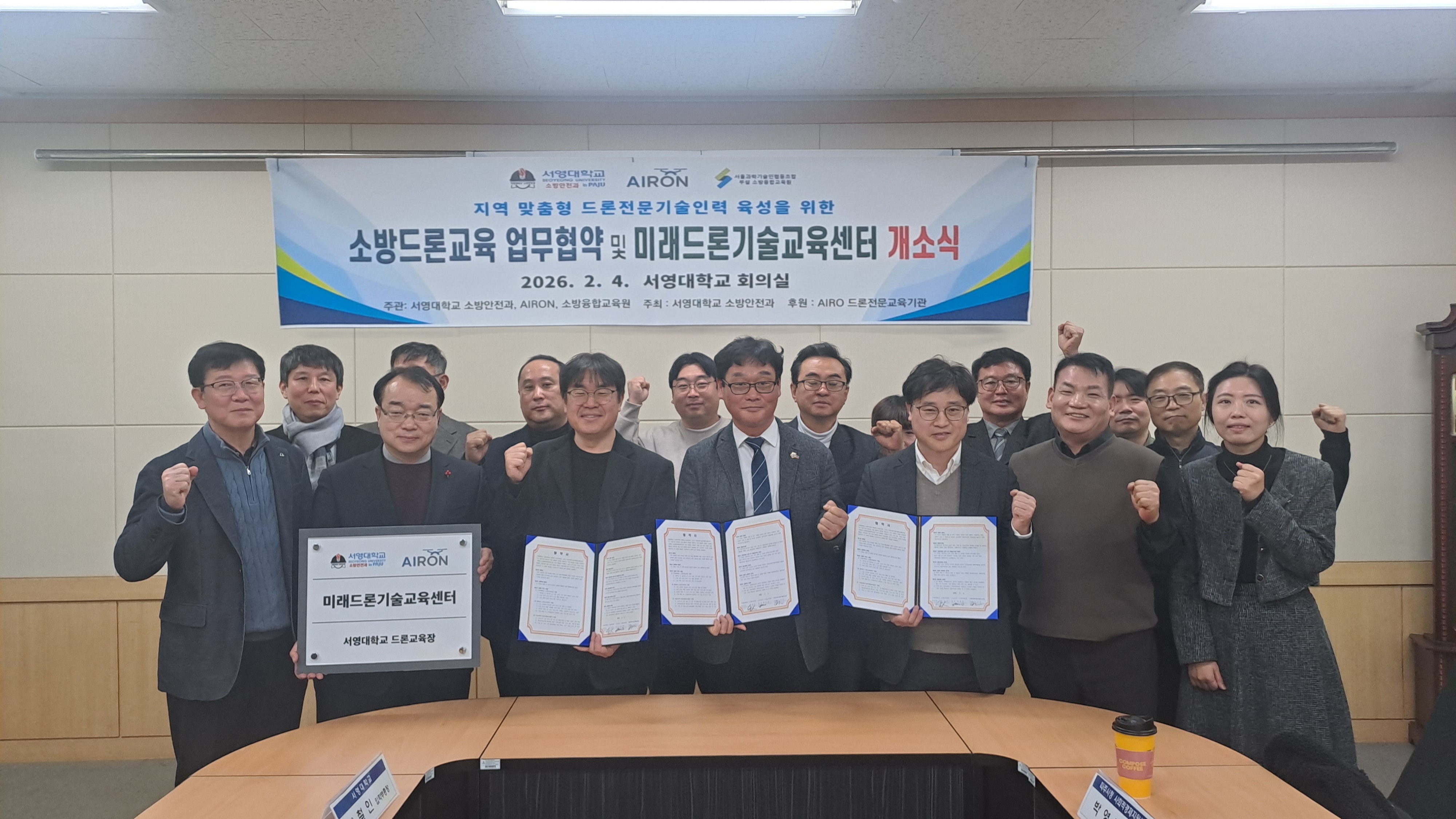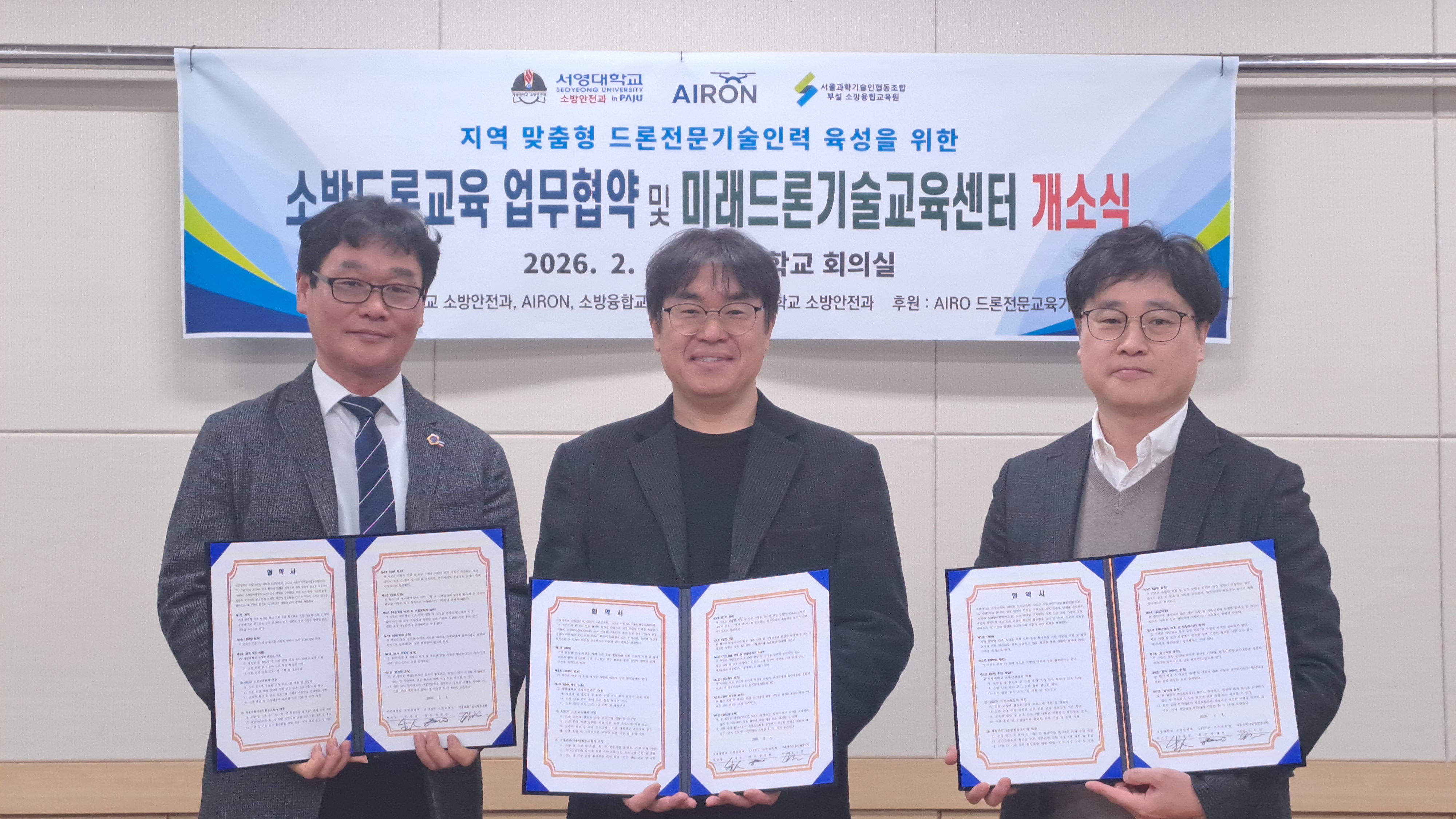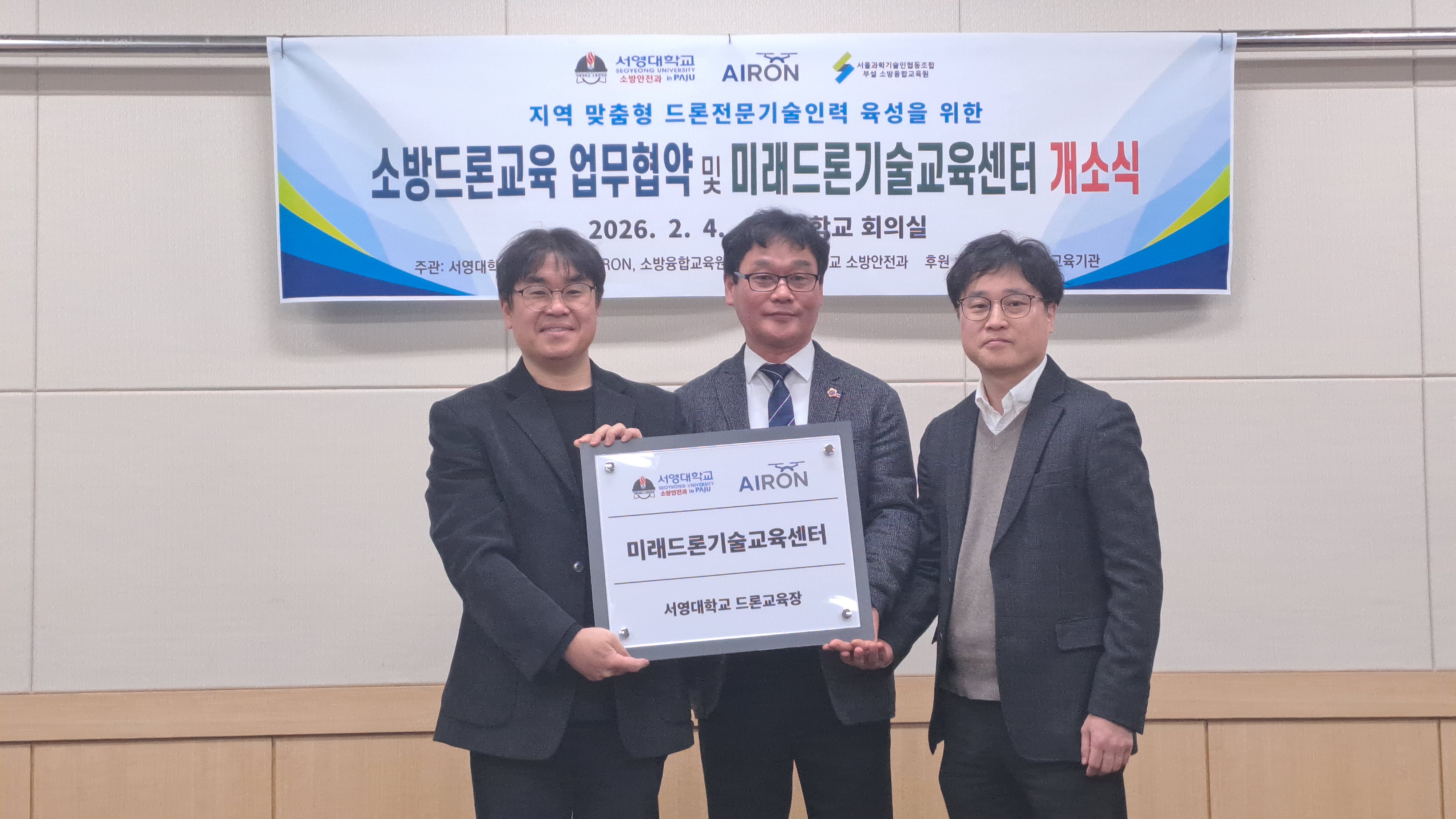 ■ 산학 협력 통한 [소방 드론] 전문 인프라 구축 O 서영대학교 파주캠퍼스(총장 김정수)는 2월 4일(화) 드론 전문 교육기관인 AIRON 드론교육원, 서울과학기술인협동조합(부설 소방융합교육원)과 함께 소방·재난 안전 분야에 특화된 드론 전문 인재 양성을 위한 업무협약을 체결하고, 미래드론기술교육센터 개소식을 개최하였다. 서영대학교 회의실에서 진행된 업무협약식에는 장철인 입학부총장, 천종철 미래평생교육원장, 김용철 ESG경영과 학과장, 이정균 소방안전과 학과장을 비롯한 서영대학교 관계자와 함영현 AIRON 드론교육원 원장, 오수언 서울과학기술인협동조합 이사장 등 각 기관 주요 관계자들이 참석해 자리를 빛냈다.