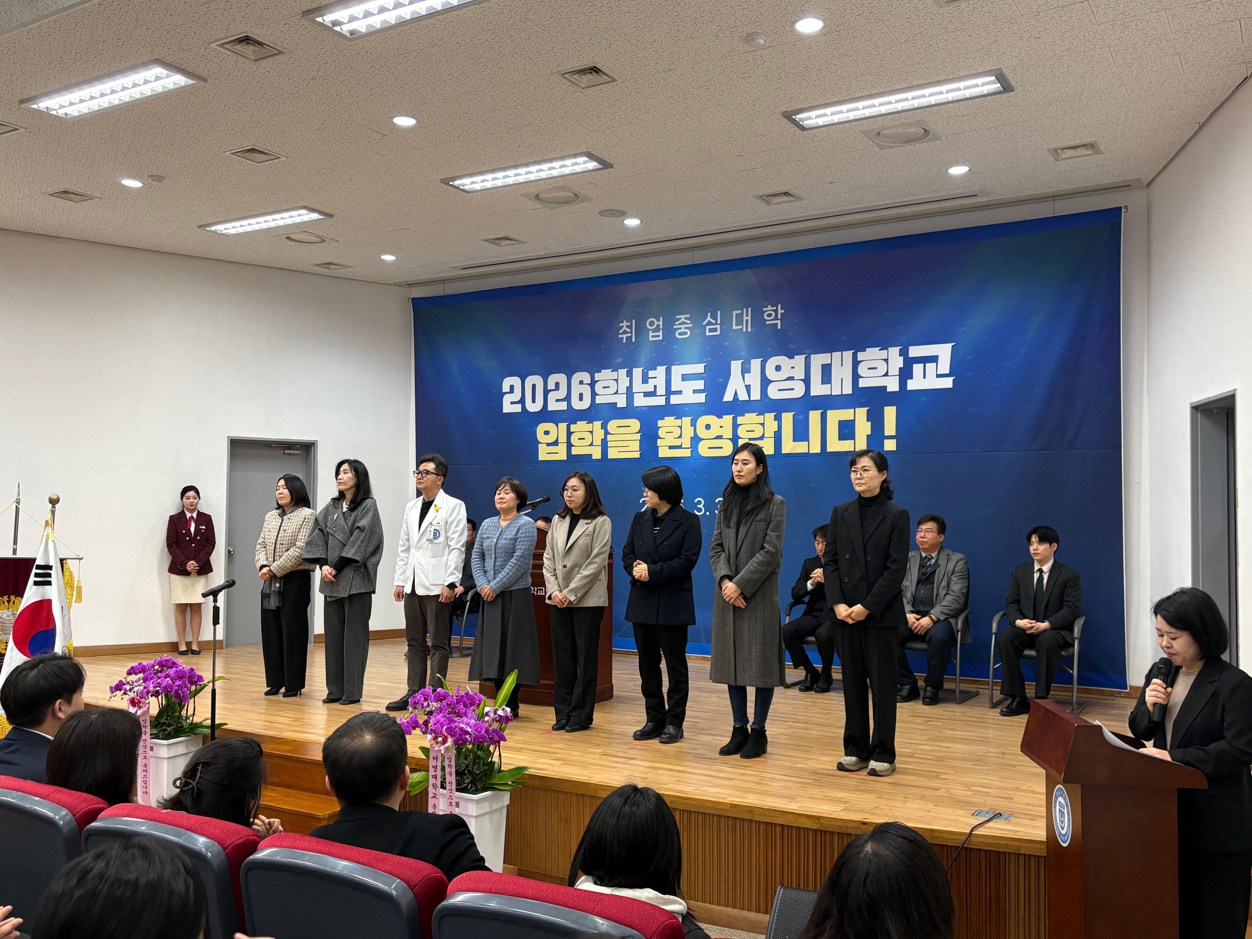 ○ 우리대학(총장 김정수)은 3월 3일(화) ‘2026학년도 서영대학교 입학식’을 개최하였다. 서영대학교 서강홀에서 진행된 이번 입학식에는 장철인 입학부총장, 김명재 취업처장, 김희재 기획부처장을 비롯한 학교 관계자와 교직원, 내빈, 신입생과 이를 축하하기 위한 가족 및 내빈이 참석하였다. 신입생들이 뜻깊은 순간을 함께할 수 있도록 주간반 신입생을 위한 주간 입학식과 야간반 신입생을 위한 야간 입학식으로 나누어 총 두 차례에 걸쳐 진행되었다.