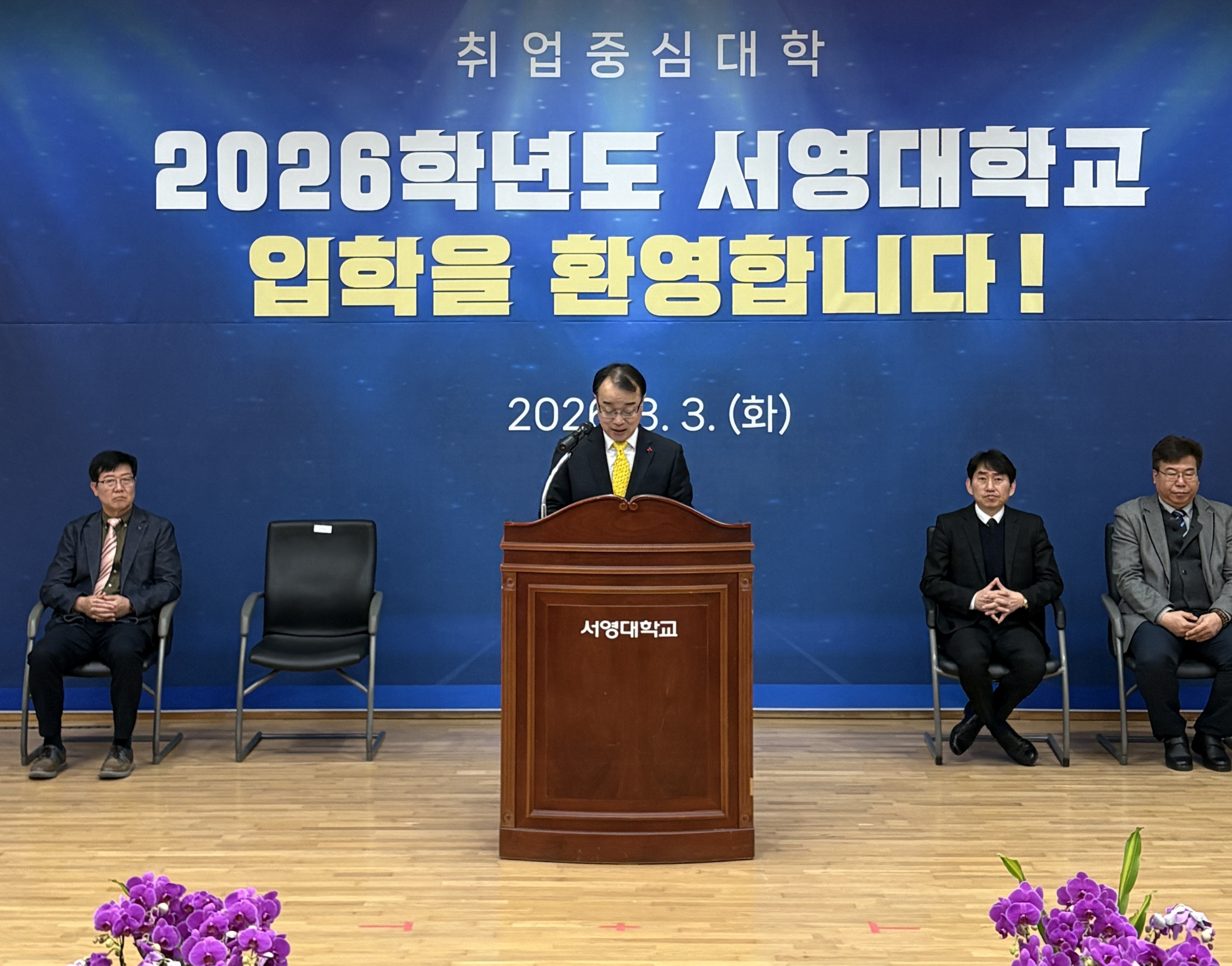○ 장철인 입학부총장은 축사를 통해 '서영의 교정에서 새로운 출발을 하는 신입생 여러분을 진심으로 환영한다. 대학에서의 배움은 단순히 지식을 쌓는 과정을 넘어 스스로를 발견하고 미래를 구체적으로 설계해 가는 소중한 시간이다. 대학 생활 속에서 분명한 목표를 세우고, 꾸준히 실력을 다져 더 큰 도약을 이루기 바란다. 우리 대학은 체계적인 교육과 따뜻한 지원을 바탕으로 여러분의 꿈을 실현할 수 있도록 든든한 동반자가 되겠다. 서영의 교정에서 마음껏 배우고 경험하며 더 큰 세상으로 힘차게 나아가길 바란다.”라고 전했다.
