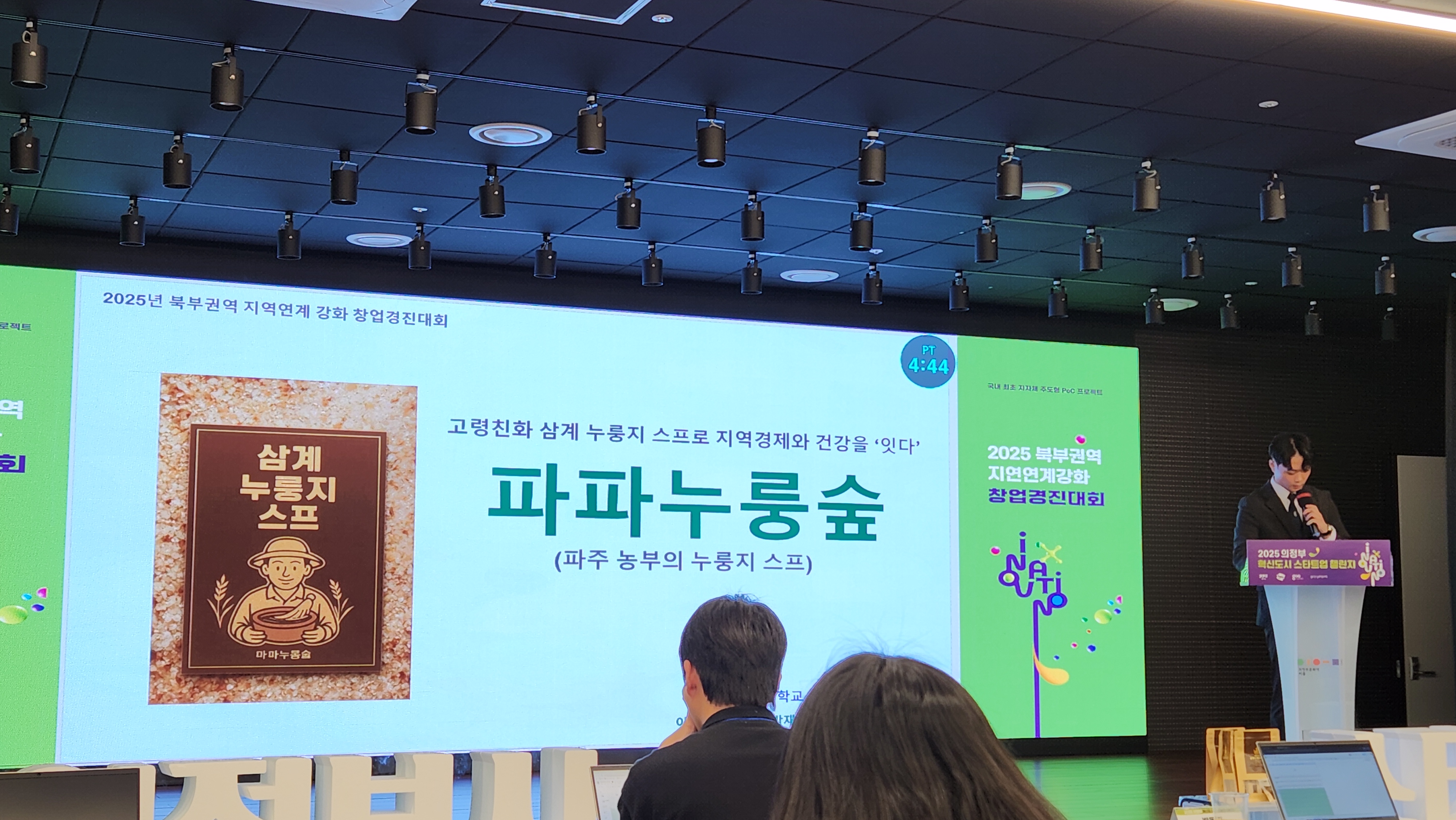 O. 이번 ‘2025 북부권역 지역연계 강화 지원 학생 부문 창업경진대회’는 12개 대학에서 참여한 총 17개의 팀 가운데 예선을 통과한 10개의 팀이 본선에서 경합을 벌였다. 우리대학 사회복지행정학과 재학생들은 지역 농산물 활용과 고령층 영양 문제에 주목하여 ‘고령친화 삼계누룽지 스프, 파파누룽숲’을 개발하였다. 해당 제품은 정부미 및 지역 특산 농산물 재고 누적, 노년층의 조리 부담과 저작 어려움, 영양 불균형 및 식사 소외 등 여러 문제를 동시에 해결하고자 하는 지속가능한 순환형 고령친화 식품 솔루션이라는 평가를 받았다.